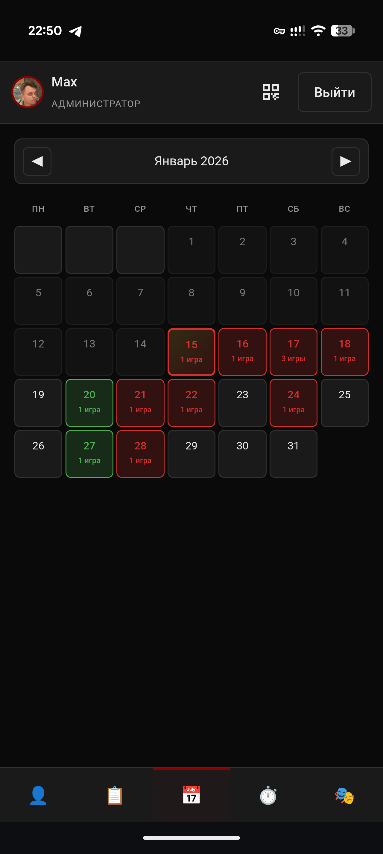- Онлайн-запись на игры и календарь залов